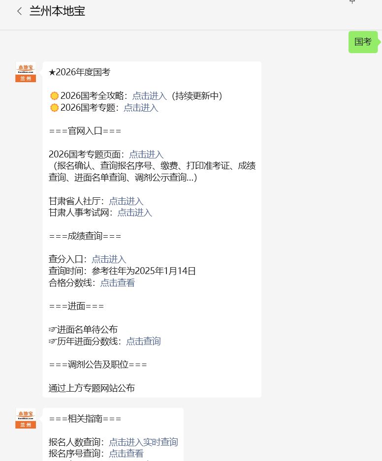 温馨提示:微信搜索公众号【兰州本地宝】,关注后在对话框回复【国考】可获2026年国考专题网站入口、岗位表下载入口、报名时间/入口、笔试/成绩查询、进面分数线查询、岗位调剂等信息。