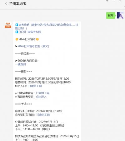 】,关注后在对话框回复【省考】可获甘肃省2026公务员省考报名时间+入口(官网)、完整版岗位表查询、缴费时间+入口、准考证打印安排、笔试成绩查询等。
